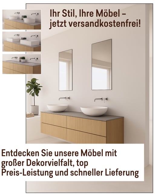 Finden Sie diverse Varianten von Badmöbeln, die wir innerhalb von ca. 8-10 Tagen als Bausatz liefern können. Verschiedene Waschbecken? Diverse Dekore? JA!